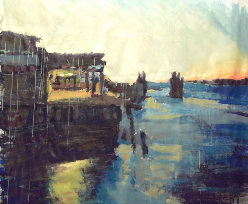 An atmosphere-based theme, like a port at dawn, done in a large format, affords the ideal opportunity for you to get used to and play around with the chromatic possibilities of acrylics. Especially very dilute acrylics, applied with a brush and scumbled. Some advice: Do a preliminary, small format sketch to plan where you'll place your colors.