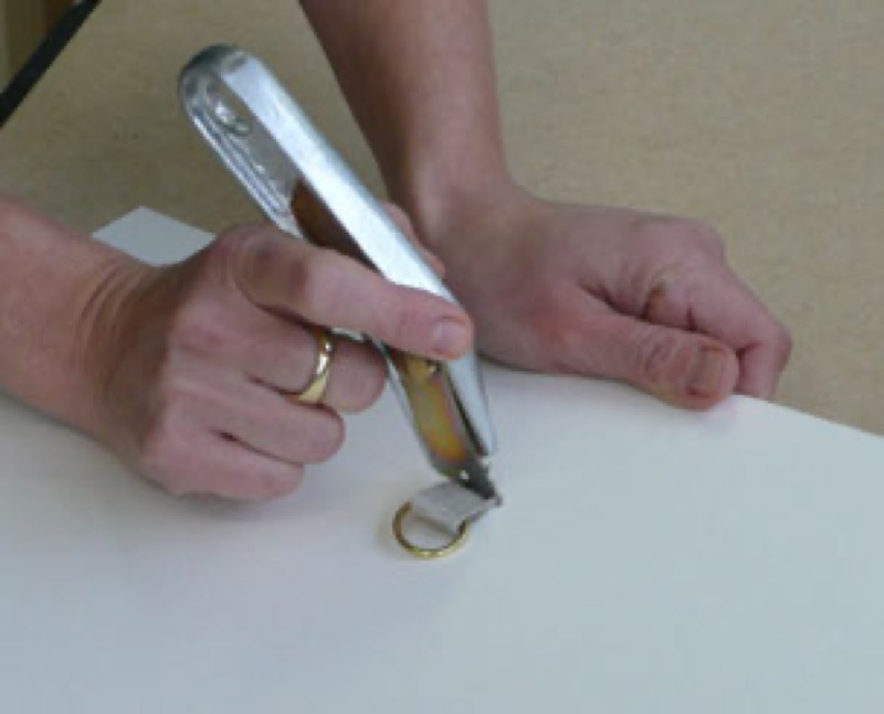 The easiest is a ring attached to the cardboard at the back of the frame by means of a flax plait. Make two such rings for frame sizes exceeding 30 x 40 cm. Your heaviest works will have to be equipped with riveted rings or closed round screw eyes set into the frame's moulding.