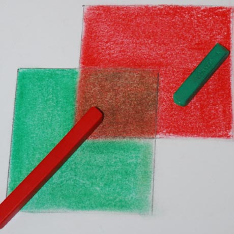 Juxtaposed, the two colors of a complementary pair are equally intense. See for yourself by painting on a sheet of paper a red square within a green square and another red square within a blue square: red on green will appear much darker!