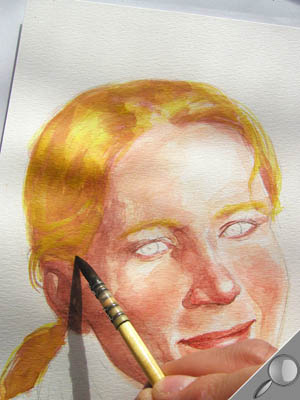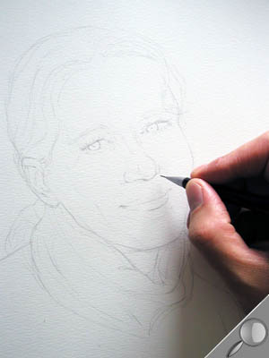Some simple formulas can help you put expression in a face with watercolors: working in a large format and making use of white spaces, for example. Your challenge: learn how to handle proportions, because you will tend (at least to begin with...) to enlarge some aspects (eyes or mouth) and reduce others (ears, neck, forehead, hair). Finally, to best convey the model's personality, remember to represent him or her down to the shoulders: this allows you to show where the head fits, and to give it an attitude, even a familiar expression.