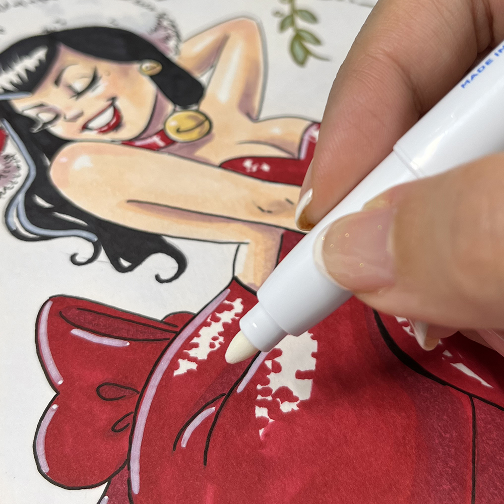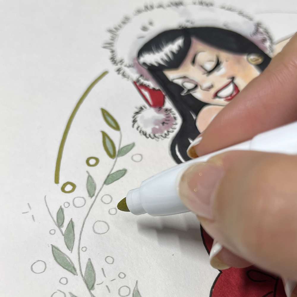 You can surround this Christmas pin-up with little green leaves when you colour it in. These leaves will guide the viewer's gaze around the character. For this final touch, you can use gold inking to separate the character from the background.