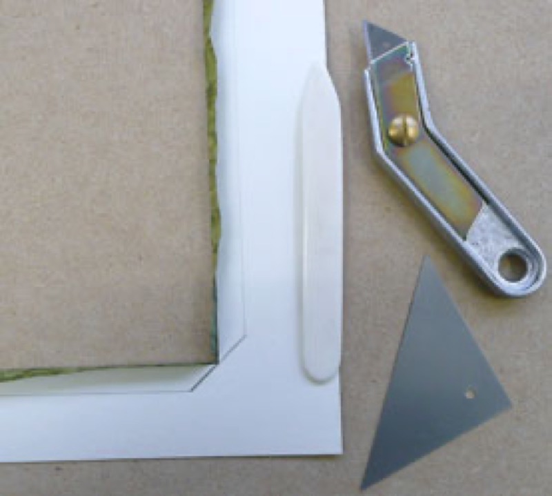 Cut the mat opening with a utility knife, allowing 2 cm to turn in.