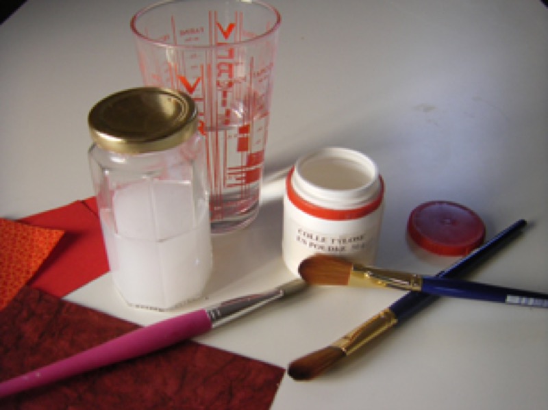 A gel (for applying to artwork): mix 1/3 part glue with 1/3 part very hot water (70° C minimum), add 1/3 part cold water and whisk;