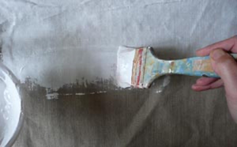 Step 1: use a wide soft bristle brush to coat the support with a first layer of gesso. Paint strips lengthwise.