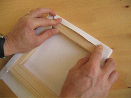 After moistening your paper, attach it to the frame, folding each of the corners around its wood strips.