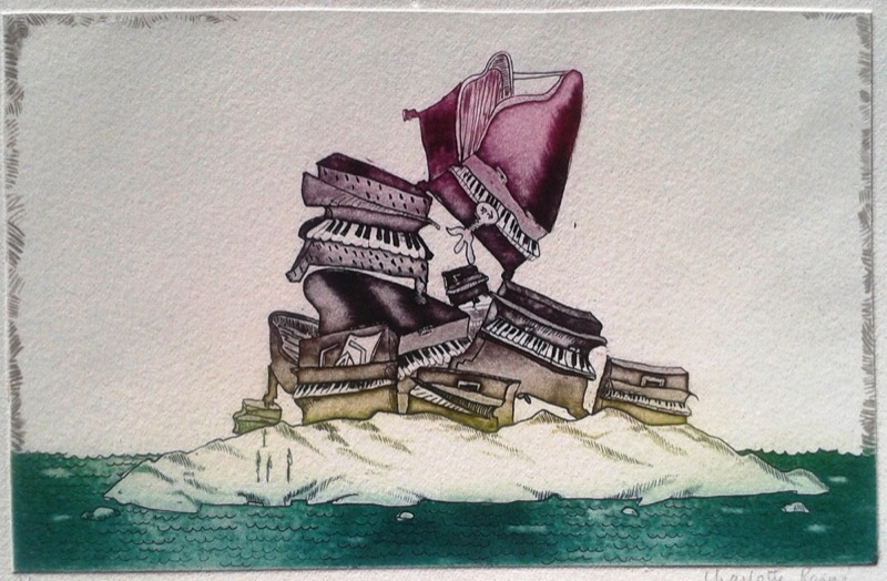 Once the image is completed, the metal plate is submerged in a tray of acid or ferric chloride. This bites into the places on the metal where the varnish was removed; the longer the plate is left in the acid, the deeper the biting: the acid only attacks the places where the copper is not protected. The ink lodges in the grooves, it will appear on the paper after printing under the press.