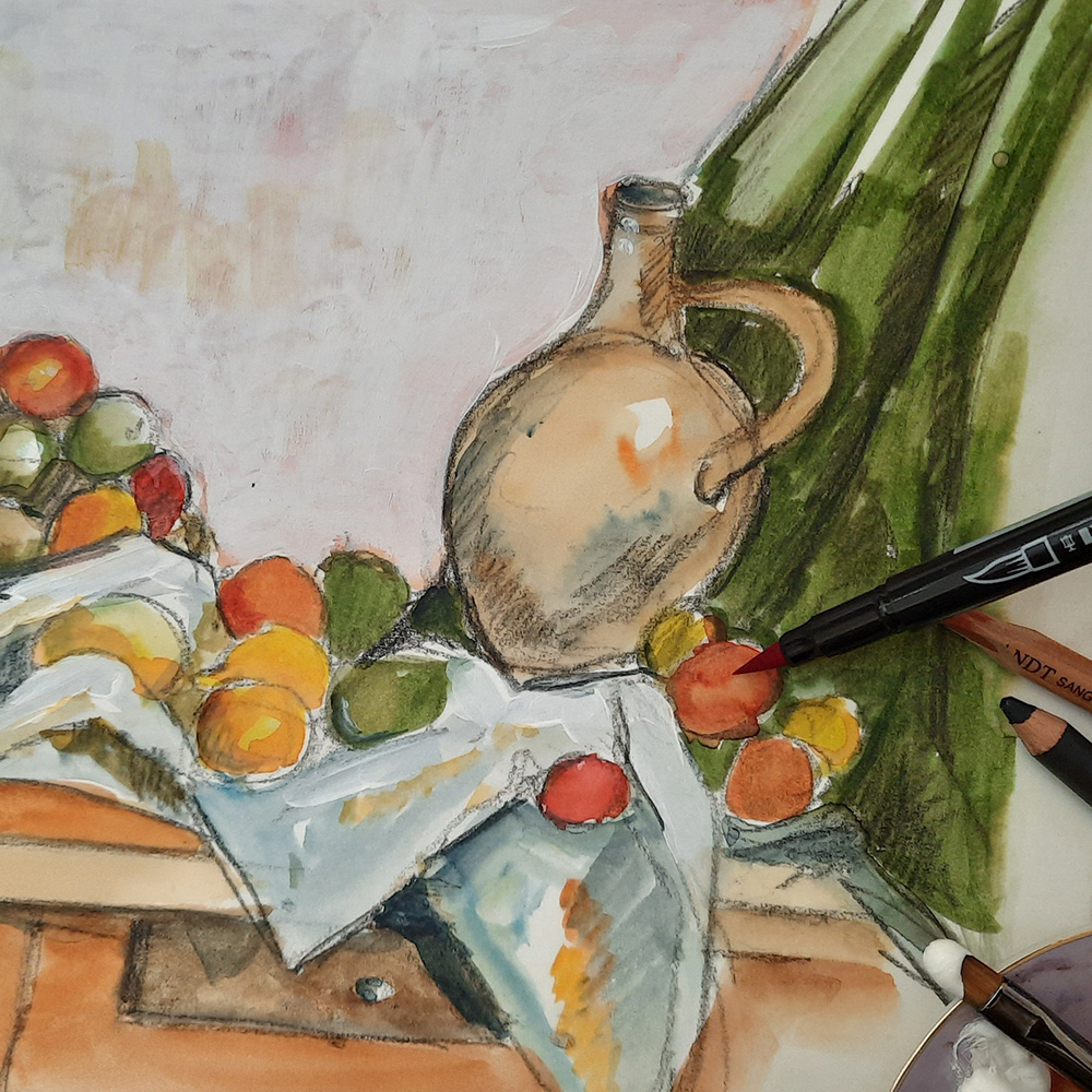 2. Next, a watercolour wash in Ochre and Burnt Sienna unified the composition (you can still see traces of this step in the lower left). More watercolour layers were added to enhance the table, the jug, and the fabric. The cloth was first covered with a bluish-green hue to give it depth.