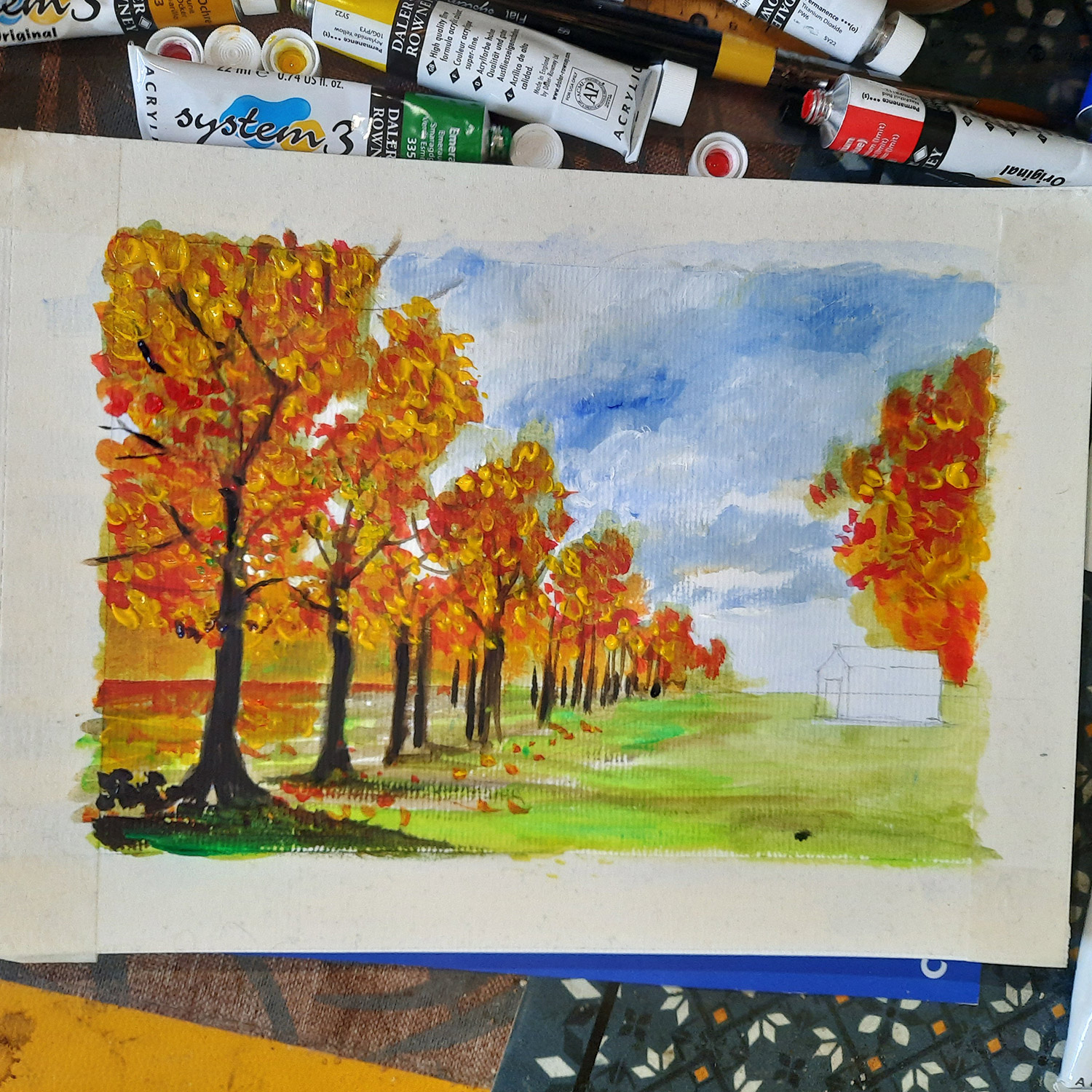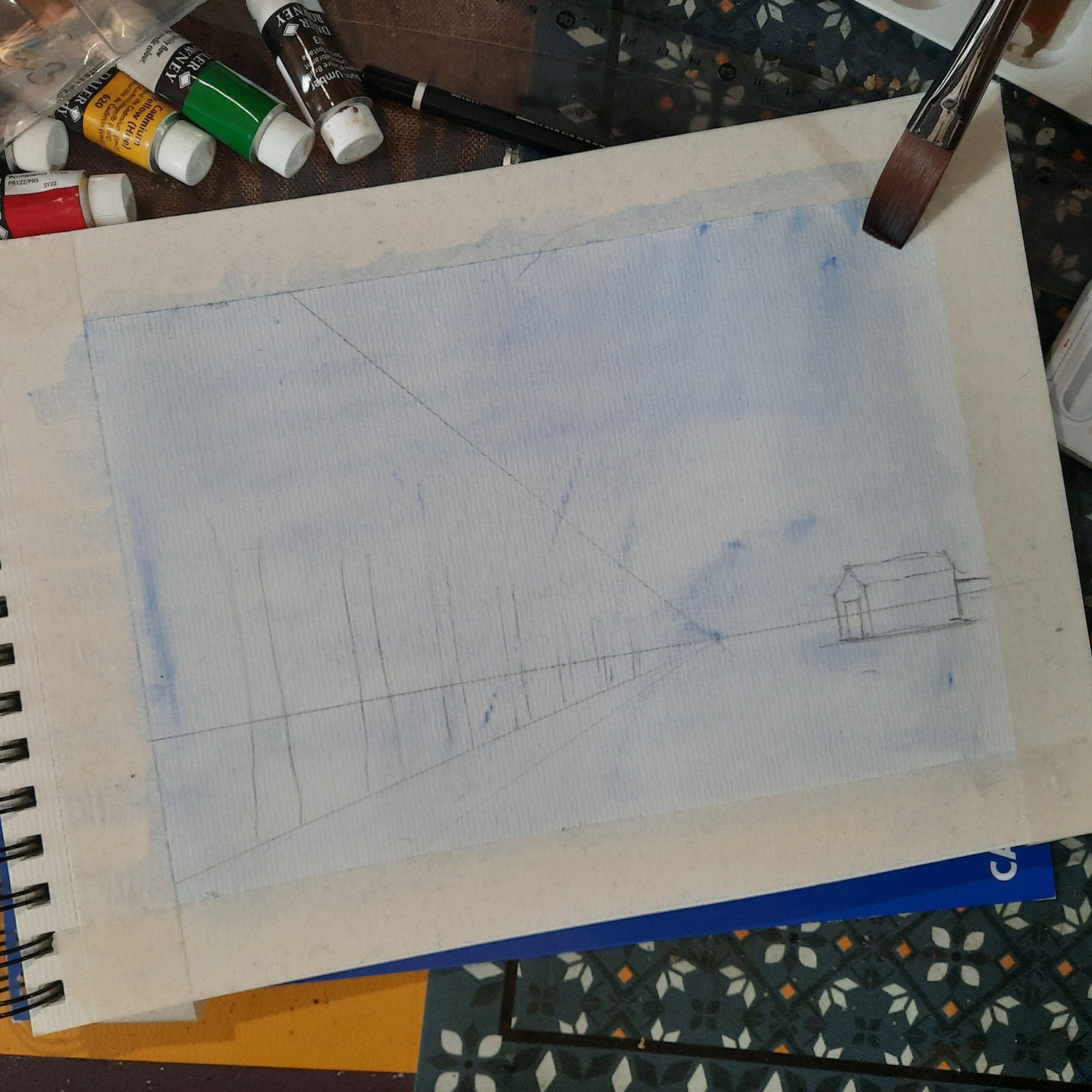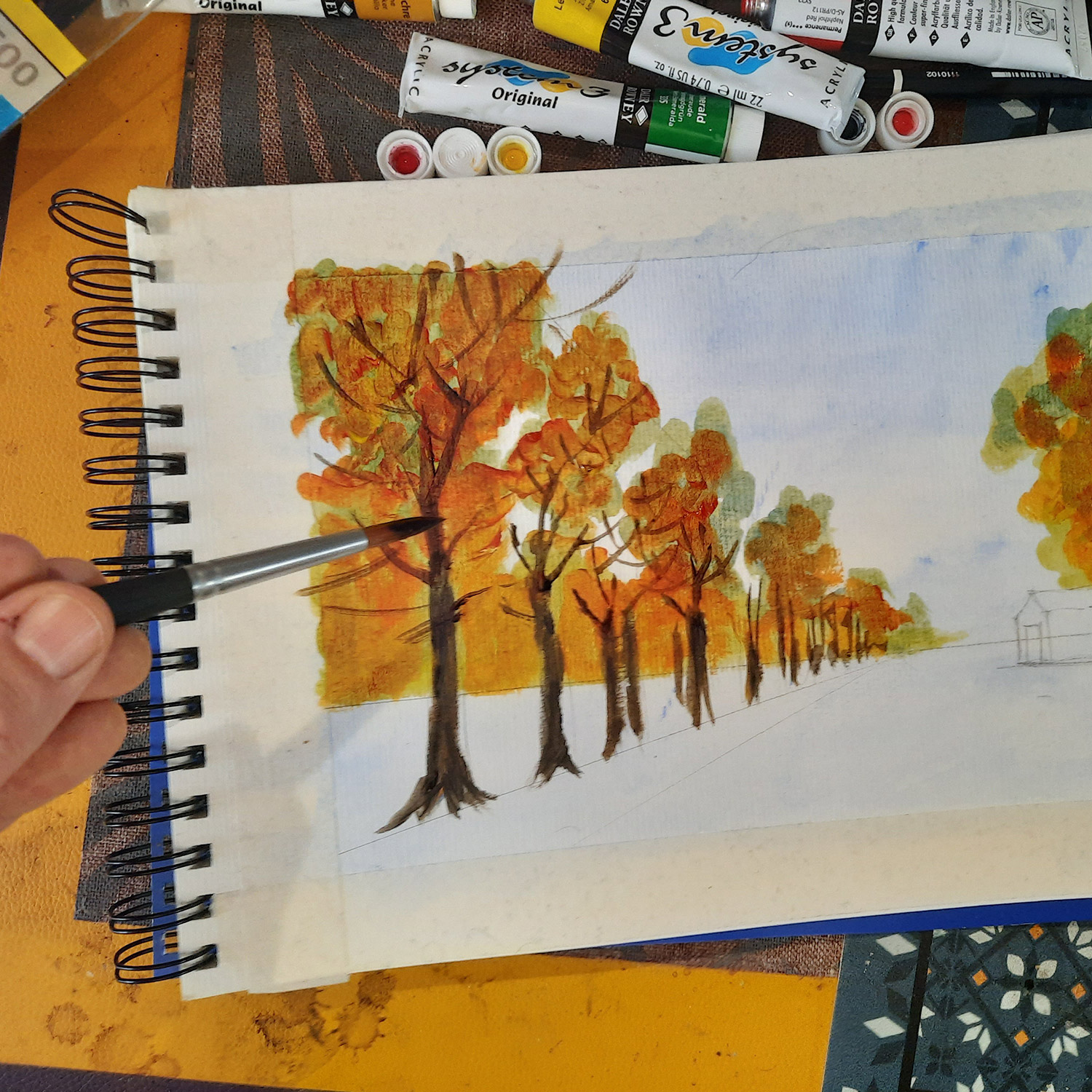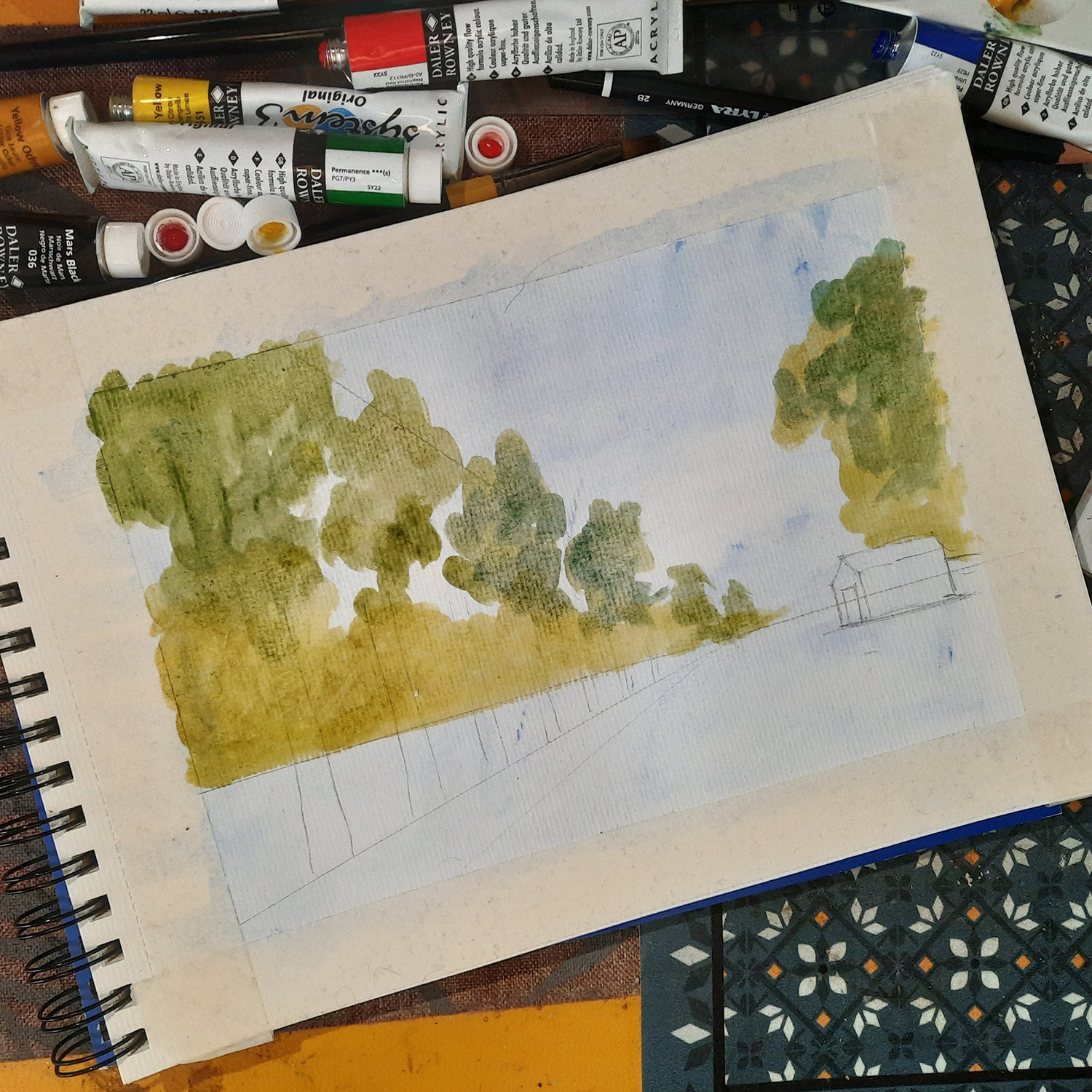 • Colours: Daler-Rowney set of 10 System 3 Acrylic colours; Daler-Rowney Aquafine watercolours for the blue background.